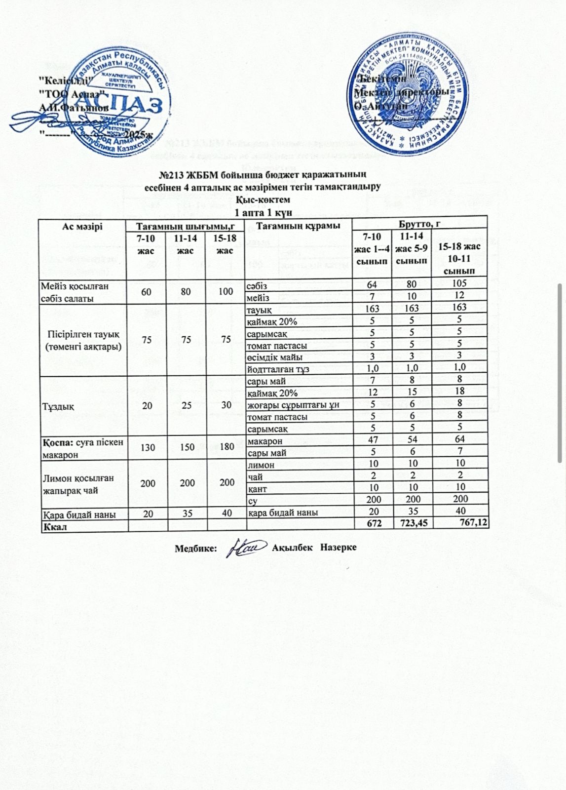 Ас мәзірі 1-апта 1-күн » «№213 жалпы білім беретін мектеп»