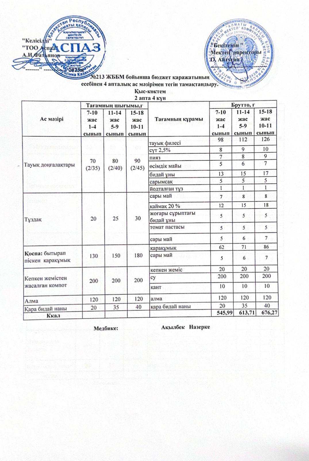 Ас мәзірі 2-апта 4-күн » «№213 жалпы білім беретін мектеп»