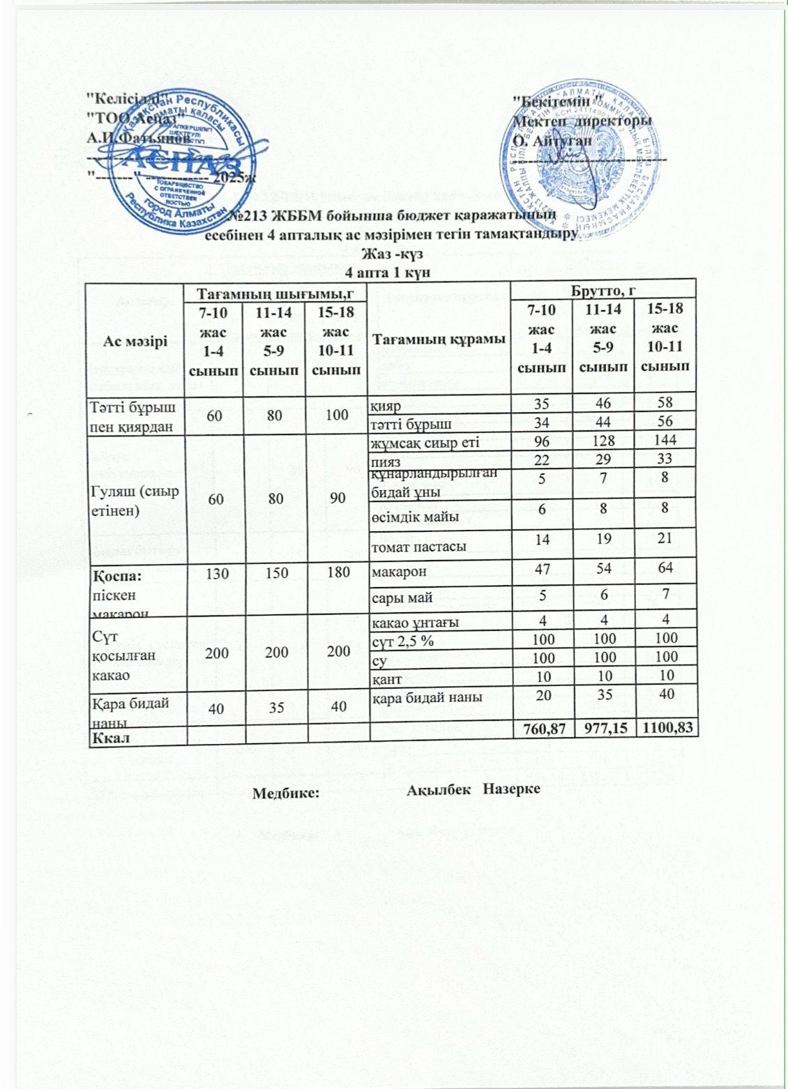 Ас мәзірі 4-апта 1-күн » «№213 жалпы білім беретін мектеп»